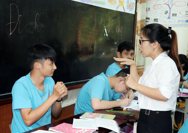 | Cô giáo Đinh Hồ Song Hà dạy học tại Trung tâm nghiên cứu và thúc đẩy văn hóa điếc. Ảnh: H.Yến |