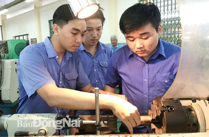 | Học sinh thực hành tại xưởng cơ khí Trường cao đẳng Nghề công nghệ cao Đồng Nai Ảnh: HẢI YẾN |
