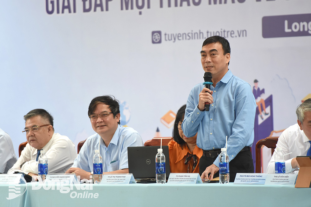 | Phó hiệu trưởng Trường đại học Khoa học xã hội và nhân văn (Đại học Quốc gia TP.HCM) Phạm Tấn Hạ tư vấn chọn ngành, chọn trường cho học sinh Đồng Nai. Ảnh: C.Nghĩa |