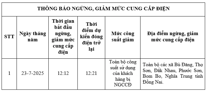 Do sự cố lưới điện xảy ra vào ngày 23-7-2025. Công ty Điện lực Đồng Nai thông báo ngừng, giảm mức cung cấp điện (NGCCĐ) đến các khách hàng sử dụng điện bị ảnh hưởng như sau: