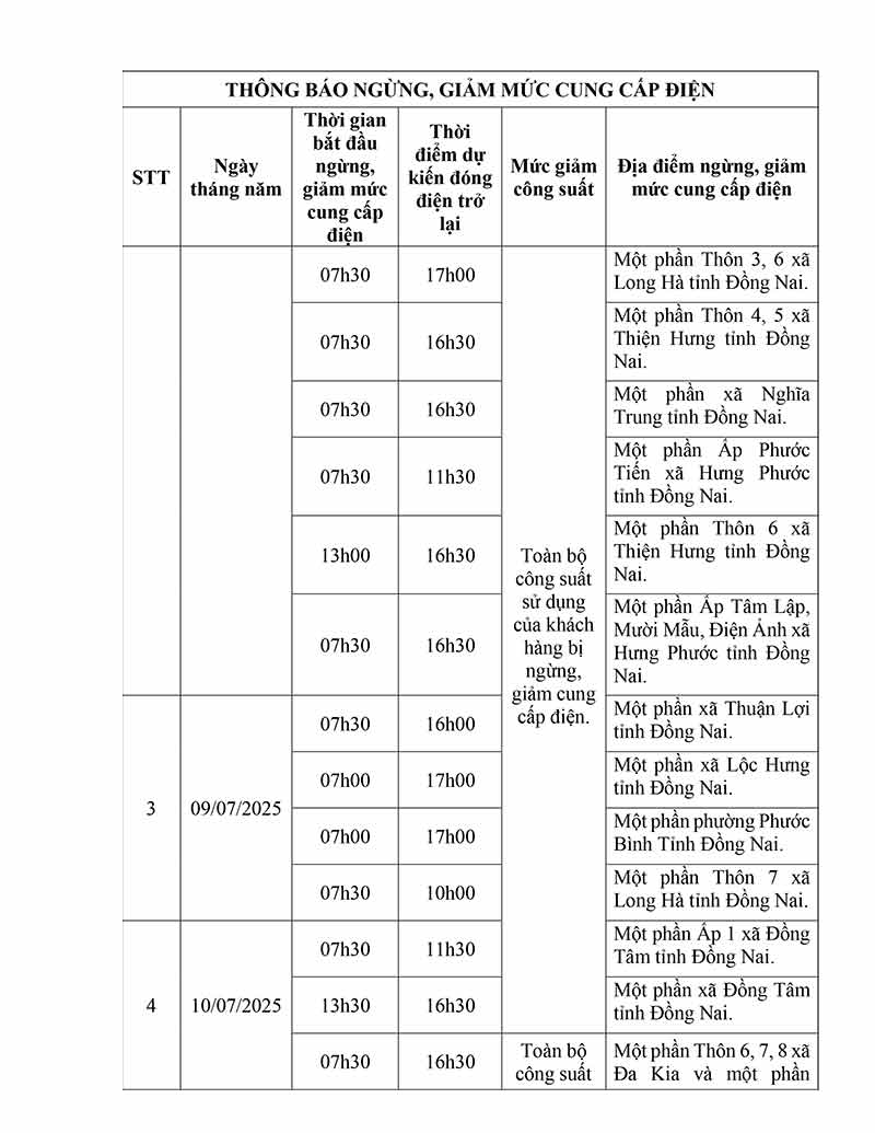 Thông báo ngừng, giảm mức cung cấp điện từ ngày 7-7 đến 13-7-2025