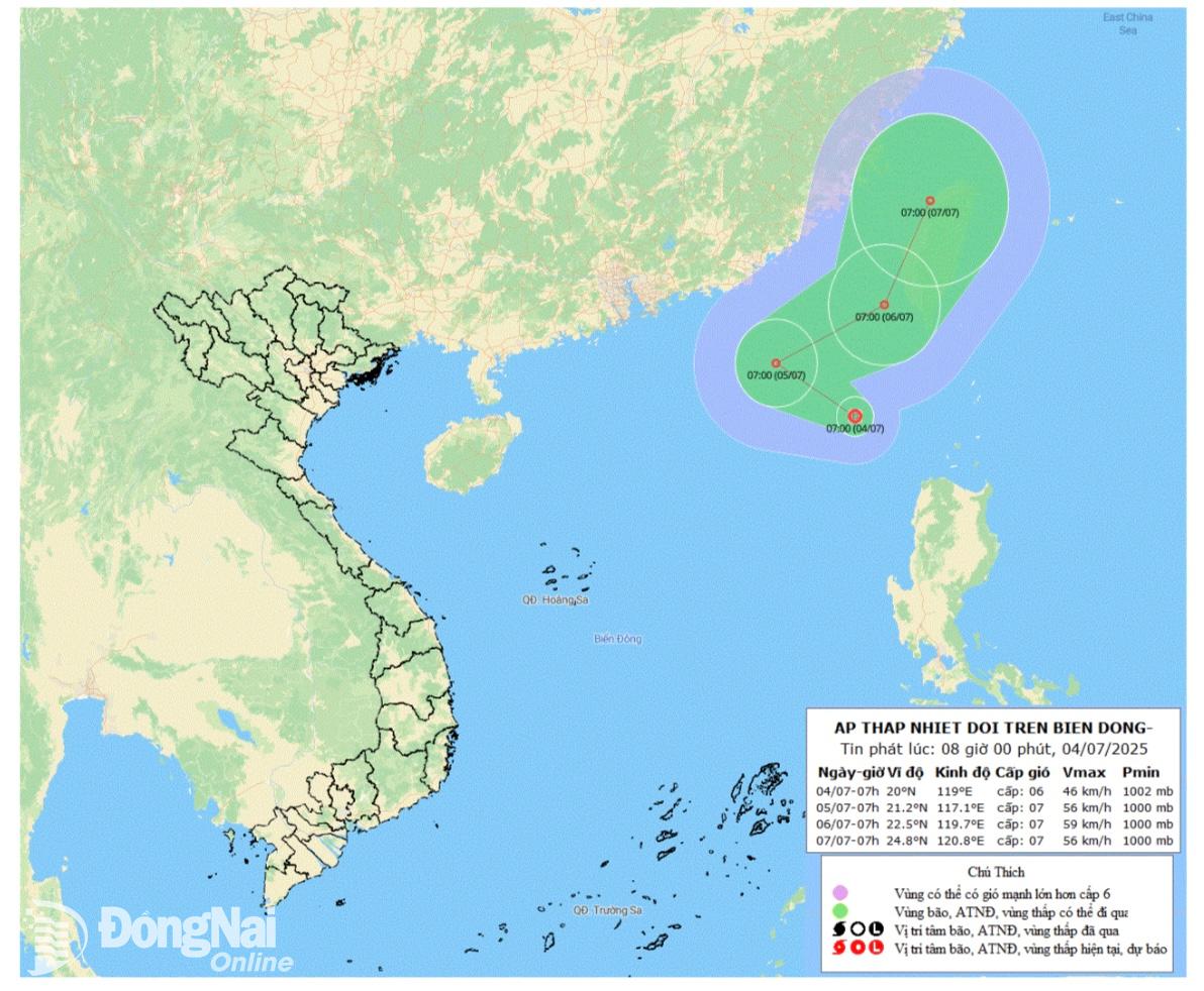 | Bản đồ dự báo quỹ đạo và cường độ áp thấp nhiệt đới phát lúc 8 giờ, ngày 4-7. Ảnh: Đài Khí tượng thủy văn Đồng Nai |