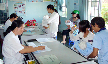 | Tất cả trẻ em dưới 6 tuổi đều được cấp thẻ BHYT miễn phí. Trong ảnh: Trẻ khám bệnh ban đầu tại Trạm y tế phường Tân Tiến, TP.Biên Hòa. |