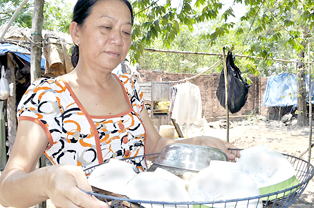 | Vợ ông Nhịn Tất Hùng Dũng bên rổ chén đĩa dày đặc bụi than. |