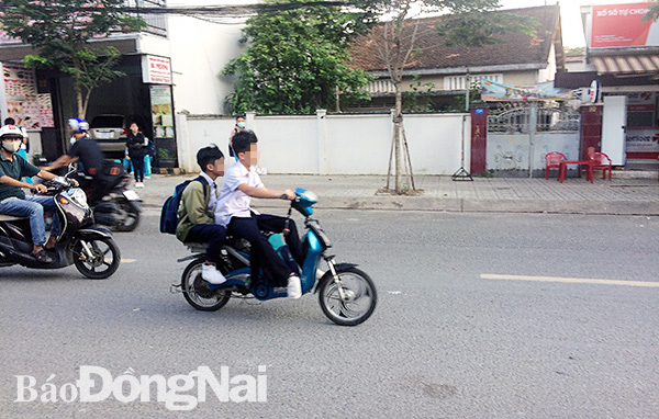 Qua ghi nhận của phóng viên Báo Đồng Nai ở nhiều trường THCS, THPT ở TP.Biên Hòa cho thấy, nhiều học sinh đi xe đạp điện không đội mũ bảo hiểm; một số em chở 2, chở 3, lao xe vun vút trên đường, chạy không đúng làn đường, thậm chí vừa chạy vừa đùa giỡn, xô đẩy nhau khiến ai nhìn thấy cũng ngán ngại.