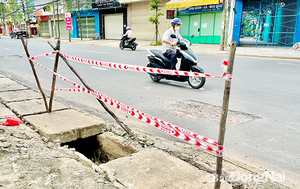 Một đoạn cống thoát nước trên đường Phạm Văn Thuận, đoạn trước hẻm 1134 (thuộc P.Tân Tiến, TP.Biên Hòa) bị hỏng nắp nhiều ngày nay nhưng chưa được khắc phục, người dân phải rào chắn tạm để cảnh báo nguy hiểm (ảnh).