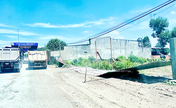 Một đoạn tường rào bằng tôn (dài khoảng 15m) đổ ập xuống đường chuyên dùng vào mỏ đá Tân Cang (P.Phước Tân, TP.Biên Hòa), đoạn gần Trạm thu phí đường chuyên dùng (ảnh). Điều đáng nói, vị trí này thường xuyên có xe tải và xe máy ra vào nên tình trạng tường rào tôn đổ ập dễ gây nguy hiểm.