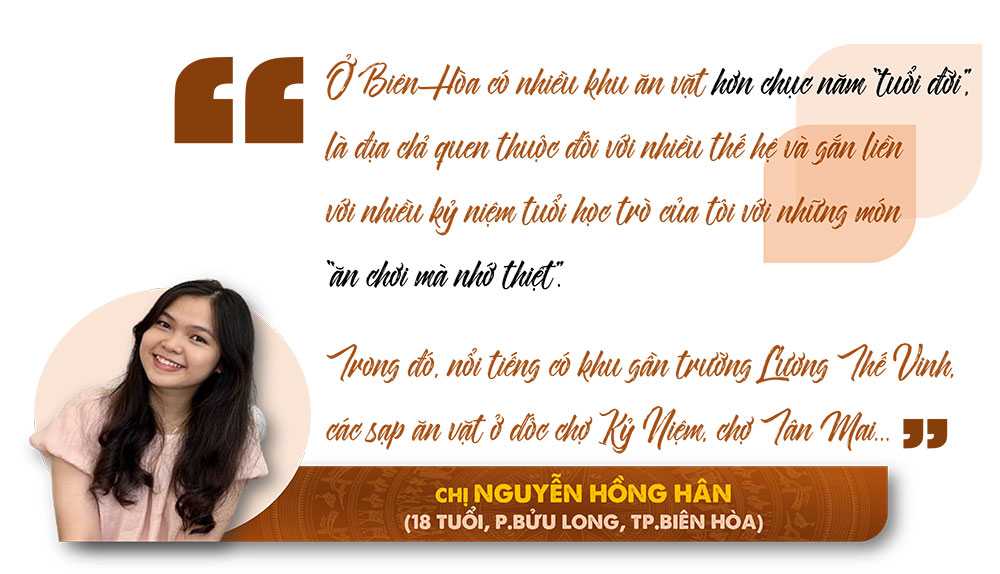| Thời gian thấm thoát trôi nhanh, nhiều hàng quán ẩm thực quen thuộc của Biên Hòa vẫn ở những góc đường, địa điểm quen thuộc đó, dường như đã cùng sống nửa đời người, ngắm thị thành qua bao mùa nắng mưa, góp nhặt biết bao thương nhớ… |
