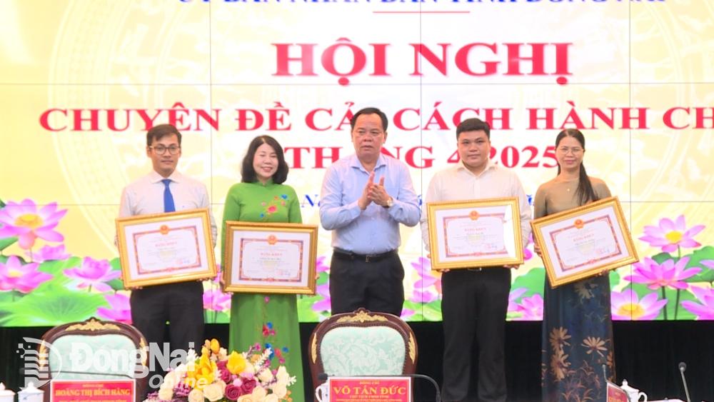 | Phó bí thư Tỉnh ủy, Chủ tịch UBND tỉnh Võ Tấn Đức khen thưởng cho các tập thể có thành tích đặc biệt xuất sắc, đóng góp tích cực trong việc cải thiện chỉ số cải cách hành chính cấp tỉnh năm 2024. Ảnh: H.Thảo |