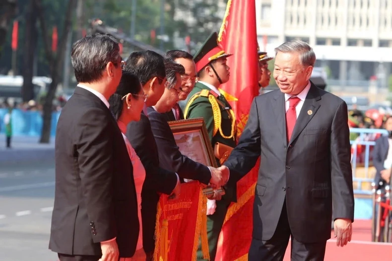 | Tổng Bí thư Tô Lâm, thay mặt lãnh đạo Đảng, Nhà nước trao tặng danh hiệu “Anh hùng Lao động” cho Đảng bộ, Chính quyền và Nhân dân Thành phố Hồ Chí Minh. Ảnh: TTXVN |