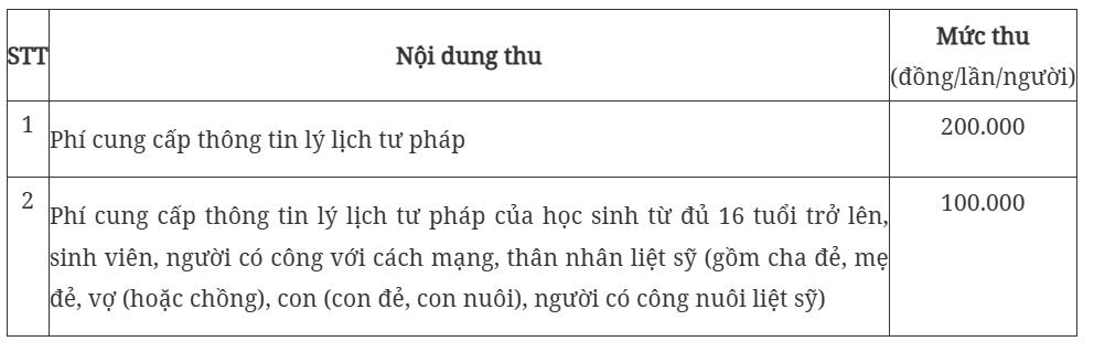 Mức thu phí cung cấp thông tin lý lịch tư pháp thực hiện như sau: