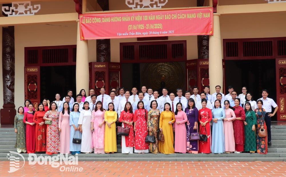 | Lãnh đạo Ban Tuyên giáo và dân vận Tỉnh ủy, Sở Văn hóa – thể thao và du lịch, Hội nhà báo tỉnh cùng các nhà báo tiêu biểu dâng hương tại Văn miếu Trấn Biên. Ảnh: Hải Yến. |