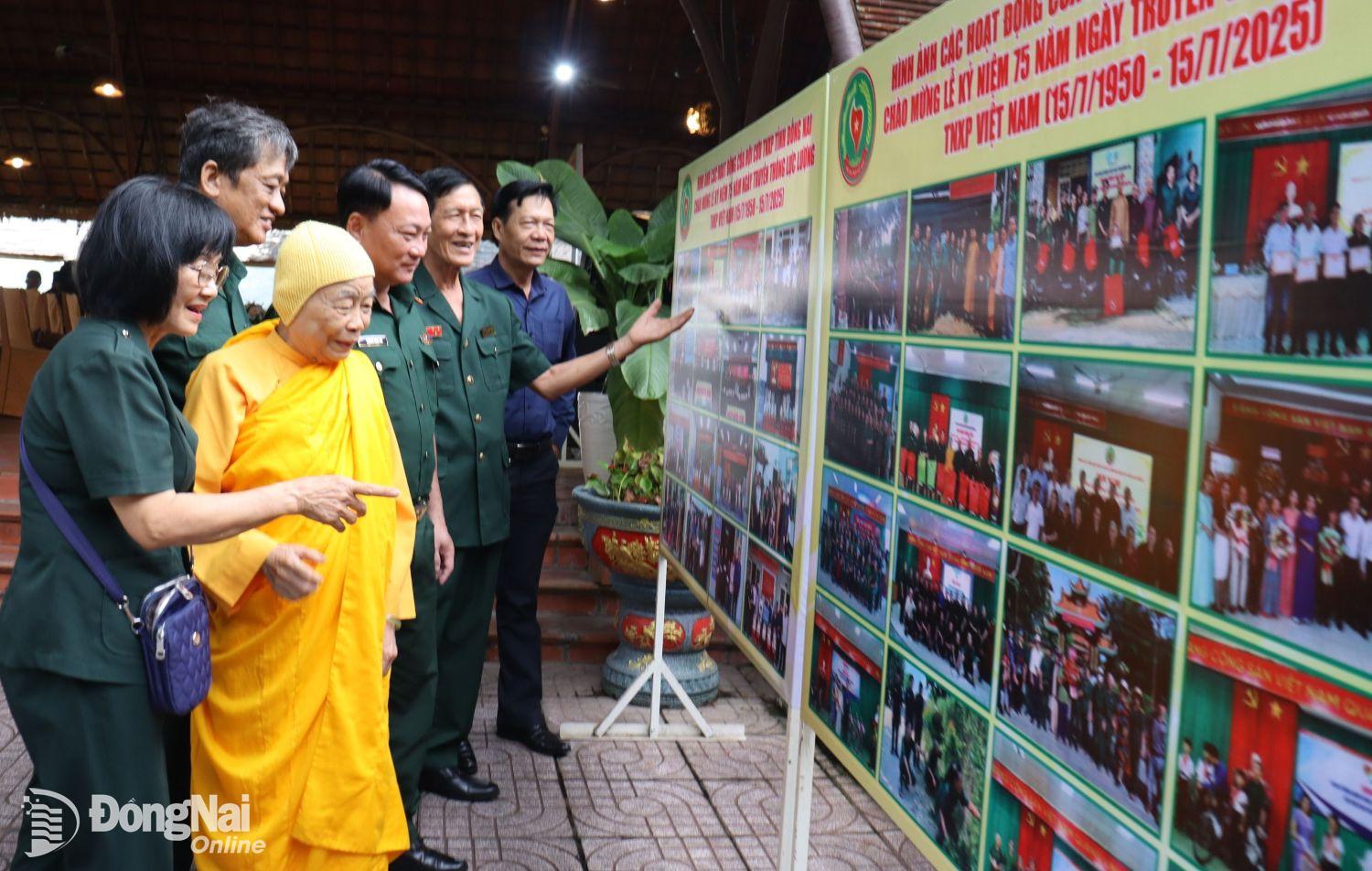 | Cán bộ, hội viên Hội Cựu Thanh niên xung phong Đồng Nai và tỉnh Bình Phước tham quan hình ảnh trưng bày trong buổi họp mặt. Ảnh: Nam Anh |