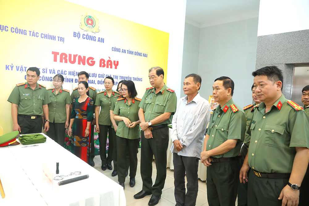 | Thiếu tướng Lê Hồng Hiệp, Phó cục trưởng Cục Công tác chính trị (thứ 2 từ phải qua), cùng lãnh đạo Công an Đồng Nai và thân nhân liệt sĩ tham quan kỷ vật trưng bày. Ảnh: T.Tâm |