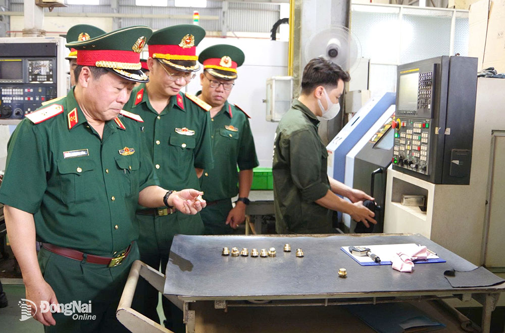 | Thiếu tướng Đinh Ngọc Tường, Bí thư Đảng ủy, Chính ủy Binh chủng Công binh (bìa trái) thăm, kiểm tra hoạt động tại Nhà máy Z756. Ảnh: ĐVCC |