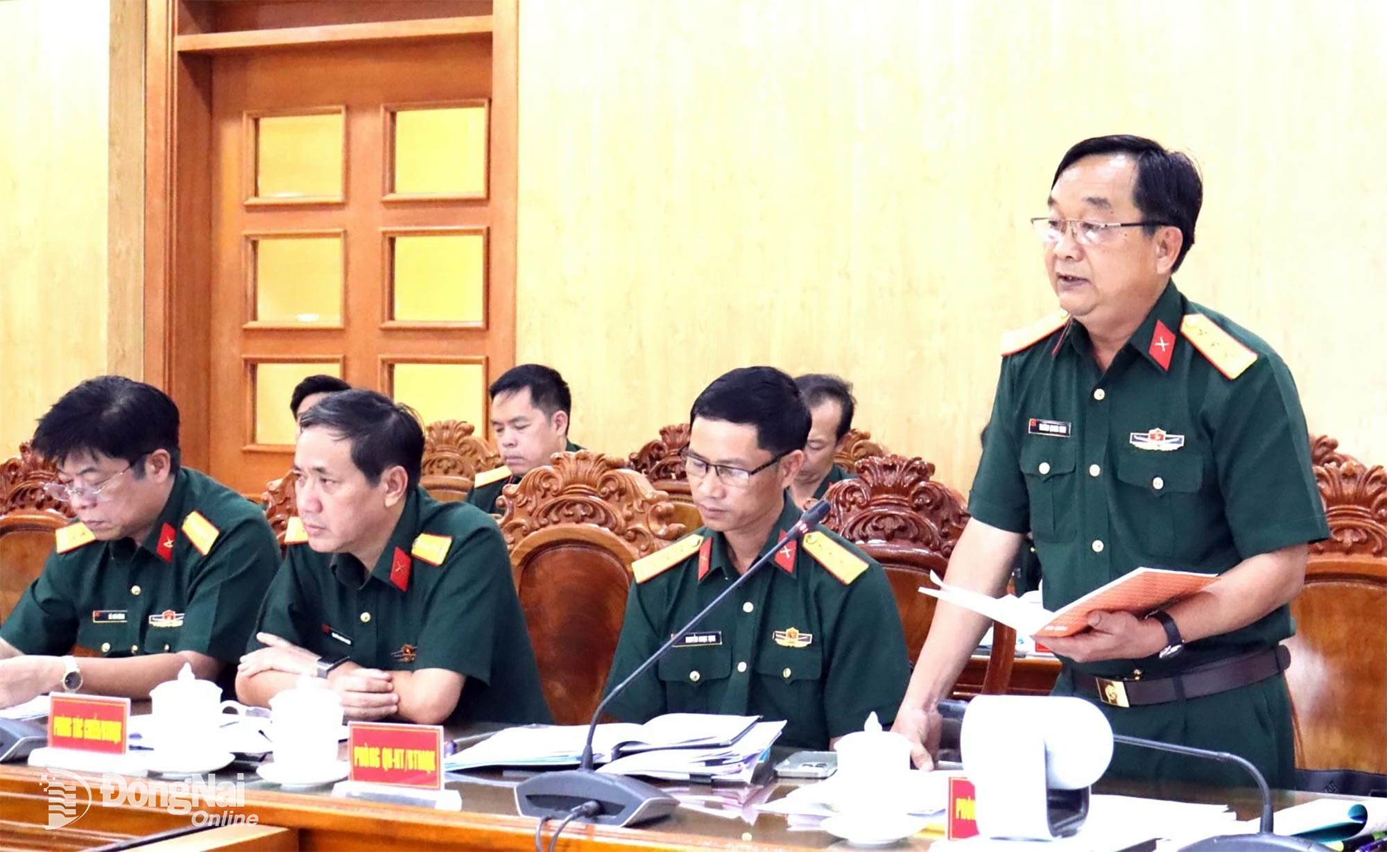 | Thiếu tướng Đặng Văn Lẫm phát biểu tại Bộ Chỉ huy quân sự tỉnh. Ảnh: Nguyệt Hà |