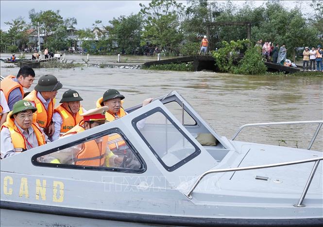 | Tổng Bí thư Tô Lâm đến vùng bị chia cắt do mưa lũ tại thôn Khuông Phò Đông, xã Quảng Điền, TP. Huế. Ảnh: TTXVN |