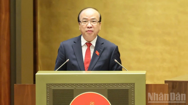| Bộ trưởng Tư pháp Hoàng Thanh Tùng trình bày Tờ trình dự thảo Nghị quyết. Ảnh: DUY LINH |