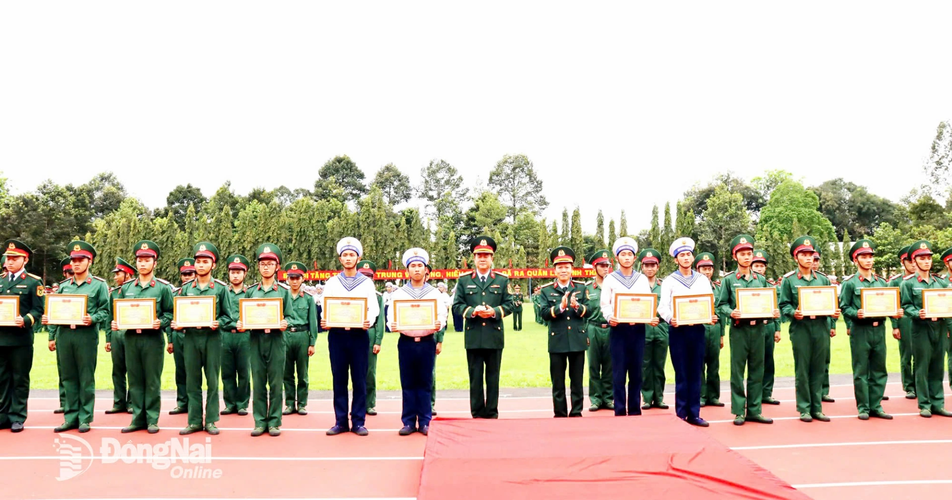 | Thủ trưởng nhà trường khen thưởng các tập thể và cá nhân xuất sắc trong khóa học. Ảnh: Nguyệt Hà |