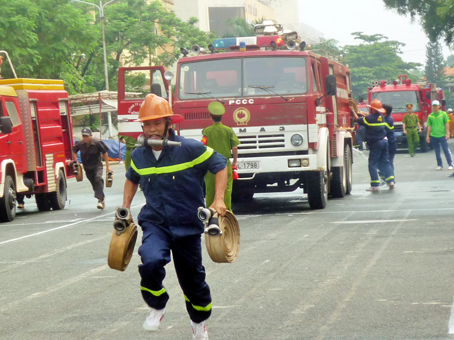 | Đội Phòng cháy, chữa cháy chuyên trách của Tổng công ty cao su Đồng Nai tham gia diễn tập chữa cháy. |