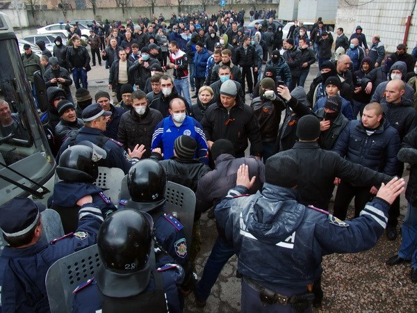 | Cảnh sát Ukraine cố gắng ngăn người biểu tình chiếm giữ trụ sở cơ quan cảnh sát ở thành phố Horlivka, gần Donetsk ngày 14/4. (Nguồn: AFP/TTXVN) |