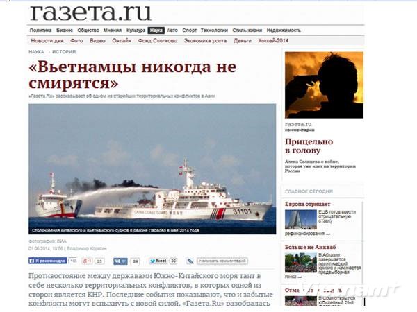 Ngày 1/6, tờ Gazeta.ru, một trong 3 báo điện tử tư nhân lớn nhất ở Nga với lượng truy cập trung bình 3 triệu lượt/ngày có bài viết: "Việt Nam sẽ không bao giờ chấp nhận" của nhà báo Vladimir Koryagin.
