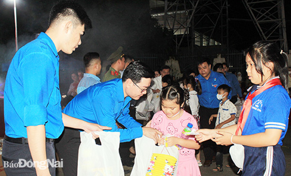| Anh Võ Văn Trung, Phó bí thư thường trực Tỉnh đoàn (thứ 2 từ trái sang) tặng quà cho các em thiếu nhi H.Trảng Bom |