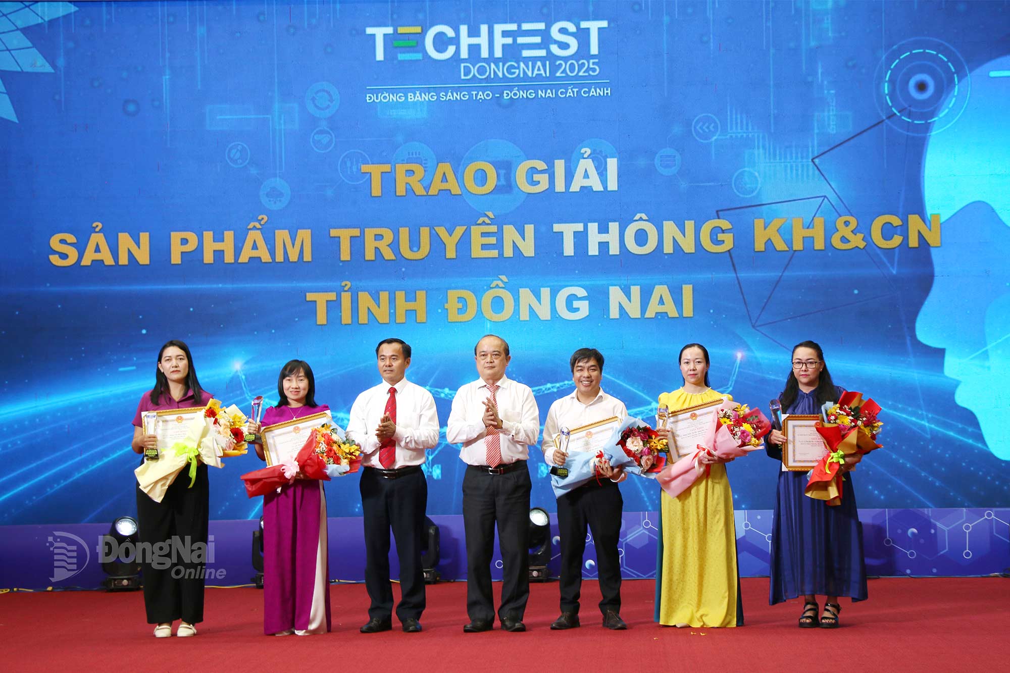 | Ủy viên Ban Thường vụ Tỉnh ủy, Phó Chủ tịch UBND tỉnh Đồng Nai Lê Trường Sơn và Tỉnh ủy viên, Giám đốc Sở Khoa học và Công nghệ tỉnh Đồng Nai Phạm Văn Trinh trao giải cho các nhóm tác giả đoạt giải Nhất Giải thưởng Sản phẩm truyền thông khoa học và công nghệ Đồng Nai năm 2025. Ảnh: Hải Quân |