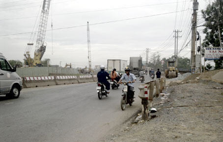 Cầu Sông Buông trên quốc lộ 51, thuộc xã Phước Tân, TP.Biên Hòa đang sửa chữa nên có làm thêm cầu tạm để xe cộ lưu thông.