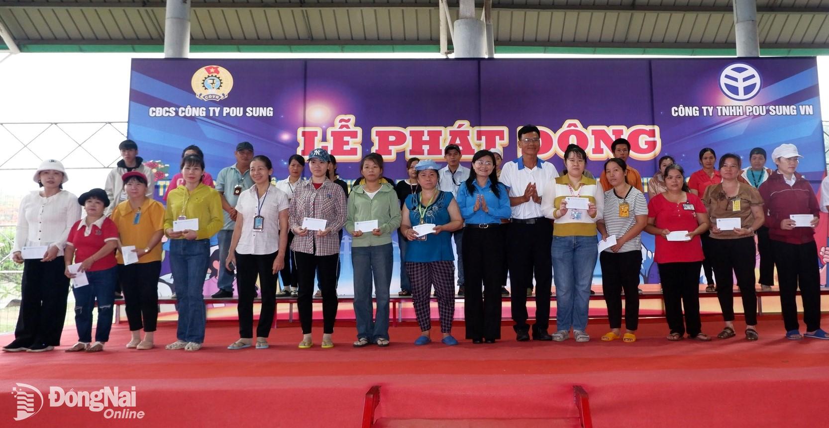 | Công đoàn cơ sở Công ty TNHH Pousung Việt Nam trao quà lao động khó khăn trong Tháng Công nhân 2025. Ảnh: L.Mai |