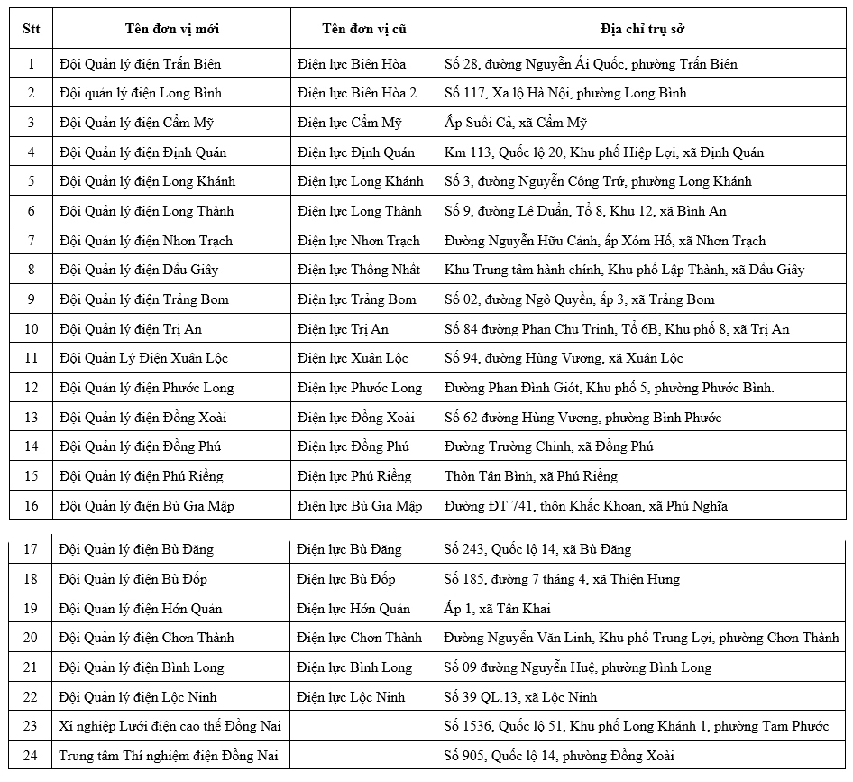 Danh sách và địa chỉ các đơn vị trực thuộc Công ty Điện lực Đồng Nai từ ngày 1-7-2025