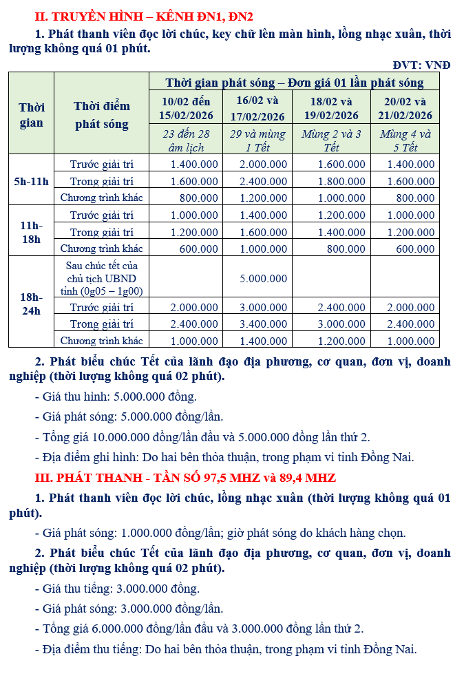 Song song với báo in, Báo và Phát thanh, Truyền hình Đồng Nai còn tổ chức chương trình “Chúc mừng năm mới Xuân Bính Ngọ 2026” trên các loại hình báo chí như phát thanh, truyền hình, báo điện tử và hạ tầng số (Fanpage, YouTube, TikTok…). Các cơ quan, doanh nghiệp, tổ chức… có thể gửi lời chúc mừng năm mới, đăng banner, bài viết hoặc clip chúc Xuân, vừa thể hiện hình ảnh thương hiệu, vừa lan tỏa thông điệp tốt đẹp đến cộng đồng trong những ngày đầu năm mới.