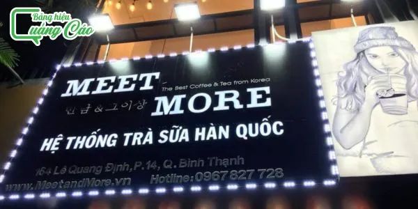 Bảng hiệu mica với độ trong suốt cao, màu sắc đa dạng, dễ dàng gia công và tạo hình, là một trong những lựa chọn phổ biến cho các cửa hàng, công ty. Đặc biệt, bảng hiệu mica hệ thống trà sữa Meet and More đang rất được ưa chuộng nhờ vẻ đẹp hiện đại và sang trọng.
