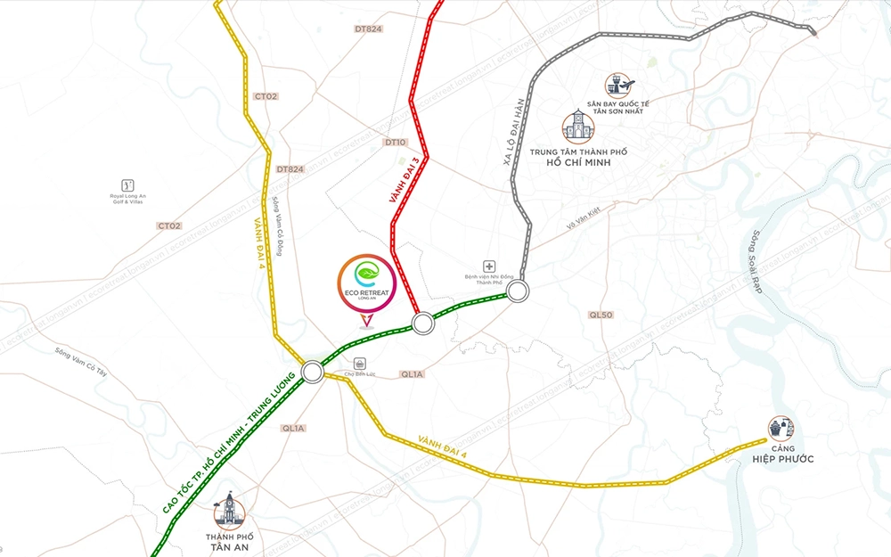 Eco Retreat tọa lạc tại xã Thanh Phú, huyện Bến Lức, tỉnh Long An, một vị trí chiến lược cận thị - cận giang - cận lộ. Dự án tiếp giáp với cao tốc TP.HCM – Trung Lương, Quốc lộ 1A, và nhiều trục đường huyết mạch khác, giúp cư dân dễ dàng di chuyển đến trung tâm TPHCM, các tỉnh miền Tây và các khu vực lân cận.