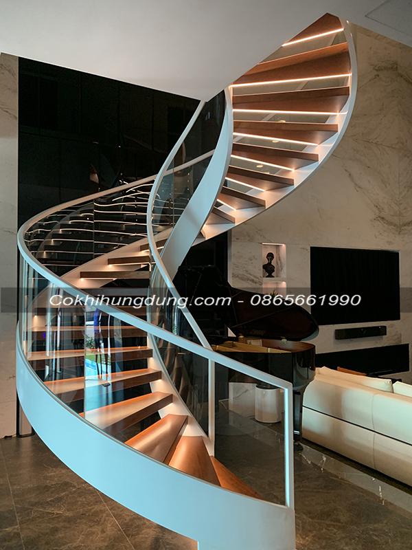 Cơ khí Hùng Dũng thường chọn các vật liệu chất lượng cao như thép bản của Nga, gỗ tự nhiên và kính cường lực để thi công cầu thang xoắn ốc. Những vật liệu này không chỉ mang lại vẻ đẹp mà còn đảm bảo sự an toàn cho người sử dụng.