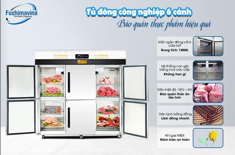 Tủ đông công nghiệp Fushimavina sử dụng công nghệ máy nén cao cấp và lớp cách nhiệt hiệu quả, tủ giúp tiết kiệm điện tối đa, giảm chi phí vận hành. Từ đó có thể nâng cao lợi nhuận cho nhà hàng. Tủ được làm bằng chất liệu inox nên luôn bền đẹp, sáng bóng. Đồng thời cũng đảm bảo được các tiêu chuẩn vệ sinh trong ngành thực phẩm. Fushimavina sẵn có lượng lớn linh kiện tại kho, có thể cung cấp và thay thế nhanh chóng khi khách hàng cần bảo hành, bảo trì thiết bị. Do đó, không làm ảnh hưởng đến hoạt động của nhà hàng.