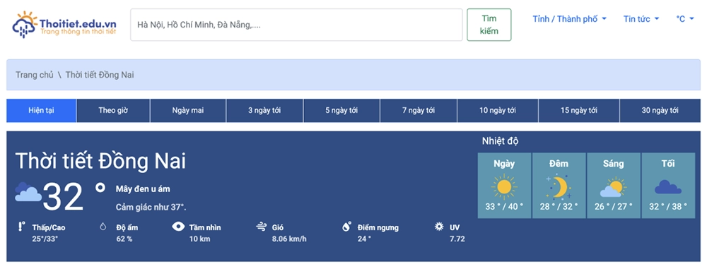 Chỉ với vài thao tác đơn giản, người dùng có thể tra cứu đầy đủ thông tin thời tiết Đồng Nai trên nền tảng thoitietedu.tv: