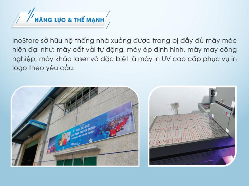 Điểm nổi bật làm nên thương hiệu Inostore chính là khả năng sản xuất theo yêu cầu, đa dạng về mẫu mã và chất liệu. Với hệ thống xưởng may – in ấn hiện đại, Inostore có thể đáp ứng từ những đơn hàng nhỏ lẻ vài chục sản phẩm cho đến các đơn hàng lớn lên đến hàng nghìn sản phẩm trong thời gian ngắn mà vẫn đảm bảo chất lượng đồng đều.