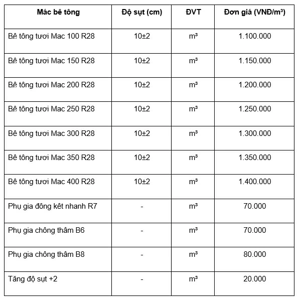 Lưu ý: Bảng giá trên chỉ mang tính chất tham khảo, có thể thay đổi theo từng thời điểm, khối lượng đặt hàng và vị trí công trình. Khách hàng nên liên hệ trực tiếp để được cung cấp báo giá bê tông tươi chính xác và nhận ưu đãi phù hợp.