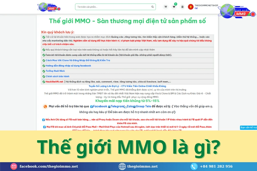 Thế giới MMO là sàn thương mại điện tử chuyên cung cấp nguyên liệu MMO như VIA Facebook, tài khoản seeding, acc clone, tài khoản Việt, ngoại và nhiều loại tài nguyên digital phục vụ quảng cáo - bán hàng - xây hệ thống - kiếm tiền online.