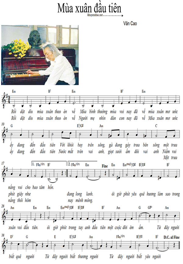 Theo Thiên Điểu (Báo Tuổi Trẻ TP.HCM), ca khúc Mùa xuân đầu tiên của nhạc sĩ Văn Cao được viết vào giáp Tết Bính Thìn năm 1976, cách đây trên 30 năm, được đăng lần đầu tiên trên số báo xuân Sài Gòn giải phóng, như lời nhạc sĩ Văn Cao tâm sự với con mình là “Cha viết bài này mừng đất nước thống nhất, nhân dân mình đoàn tụ”. Cũng vào những năm đó, Mùa xuân đầu tiên được in, biểu diễn và dịch lời Nga tại Liên Xô. Năm 1991, nhạc sĩ Nguyễn Thụy Kha làm video ca nhạc về cuộc đời Văn Cao, có đưa bài hát do ca sĩ Quốc Đông trình bày vào phim. Năm 1993 tại đêm nhạc Văn Cao, nhạc phẩm Mùa xuân đầu tiên được biểu diễn. Ca khúc được mọi người biết đến nhiều nhất qua giọng ca Thanh Thúy năm 1995 trong bộ phim ca nhạc Văn Cao - Buổi sáng có trong sự thật (đạo diễn Đinh Anh Dũng).