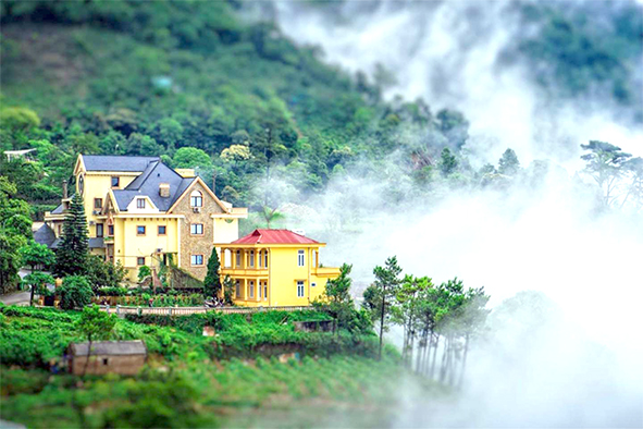Cái tên Tam Đảo có được là do 3 ngọn núi cao Thạch Bàn (1.388m), Thiên Thị (1.375m) và Phù Nghĩa (1.400m) nhô lên trên biển mây bồng bềnh. Cùng do người Pháp xây dựng, dù có diện tích nhỏ hơn rất nhiều lần so với Sa Pa (tỉnh Lào Cai) hay Đà Lạt (tỉnh Lâm Đồng) nhưng nhờ chỉ cách Hà Nội 80km nên Tam Đảo thu hút lượng khách du lịch đông gấp nhiều lần. Tỷ lệ khách đến/dân số của Tam Đảo là 1.500 lần so với Sa Pa là 39 lần và Đà Lạt là 27,8 lần. Thời điểm năm 2019, trước khi dịch Covid-19 xuất hiện, TT.Tam Đảo đã đón 1,5 triệu lượt khách du lịch - một con số kỷ lục so với dân số chỉ trên dưới 1 ngàn người. |