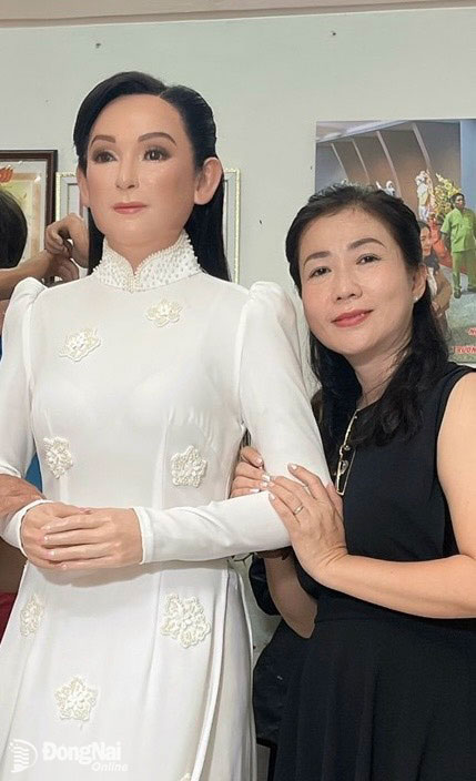 | Nghệ nhân Ngọc Diện bên sản phẩm tượng sáp nghệ sĩ Phi Nhung do chị tạo nên. Ảnh: L.V.Nhân |