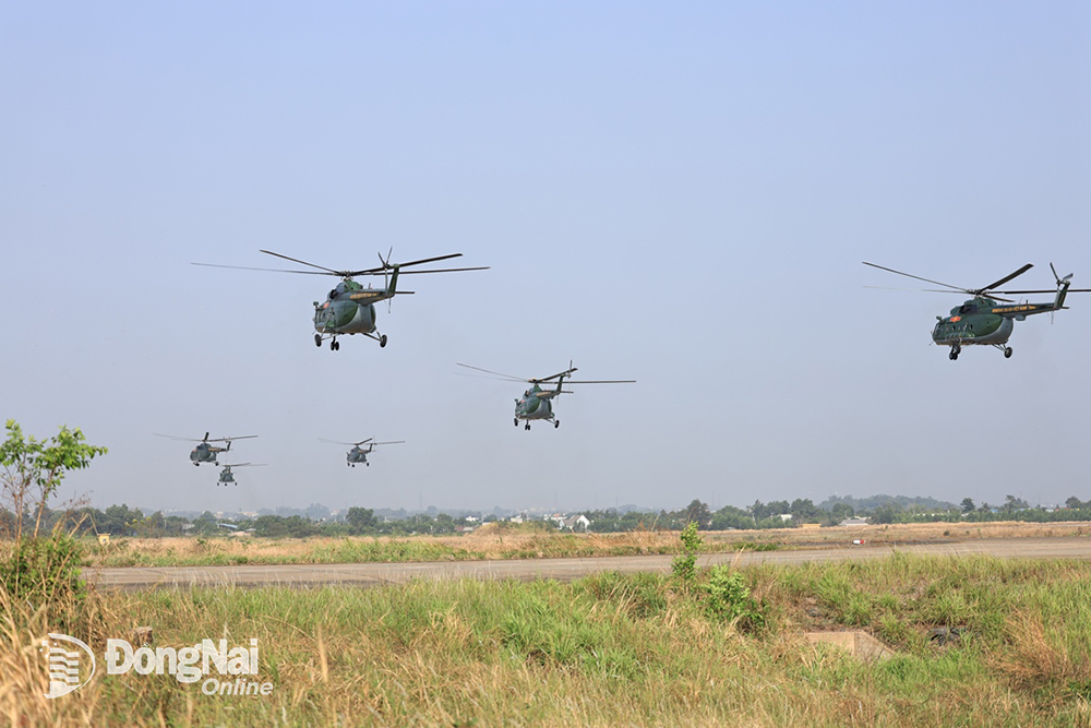 | Biên đội bay 12 chiếc Mi các loại đồng loạt cất cánh trên đường băng bay theo các tốp 3-3-4. Ảnh: Công Nghĩa |