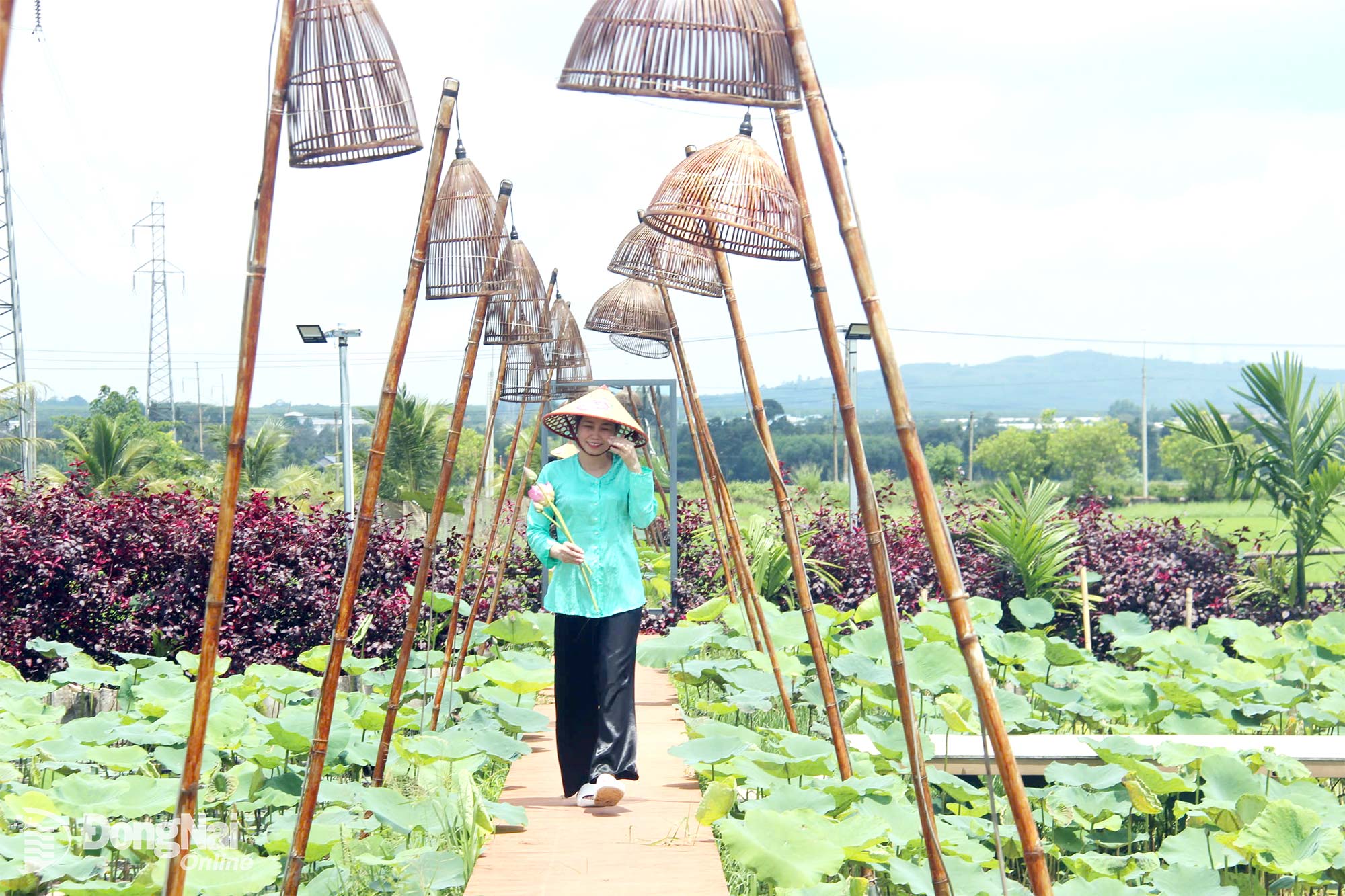 | Người dân đến tham quan, chụp ảnh với sen tại một khu du lịch nhà vườn ở phường Bình Lộc (tỉnh Đồng Nai). Ảnh: Trần Danh |