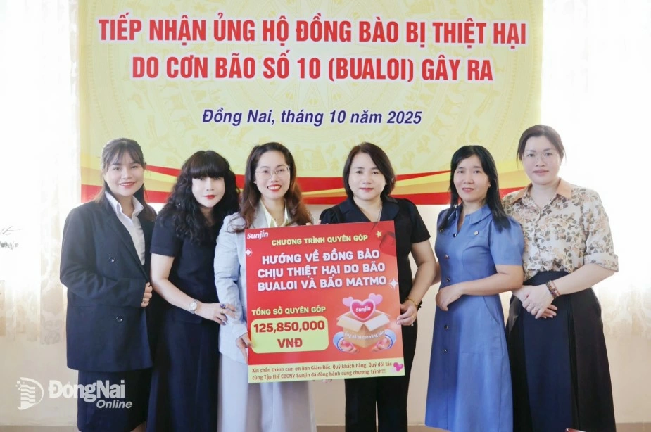 On October 15, the Vietnam Fatherland Front Committee of Dong Nai province held a ceremony to receive more than 125 million VND donated by the Board of Directors, customers, partners, and staff of Sunjin Vina Co., Ltd. to support people in various provinces and cities in recovering from the damage caused by storm No. 10.