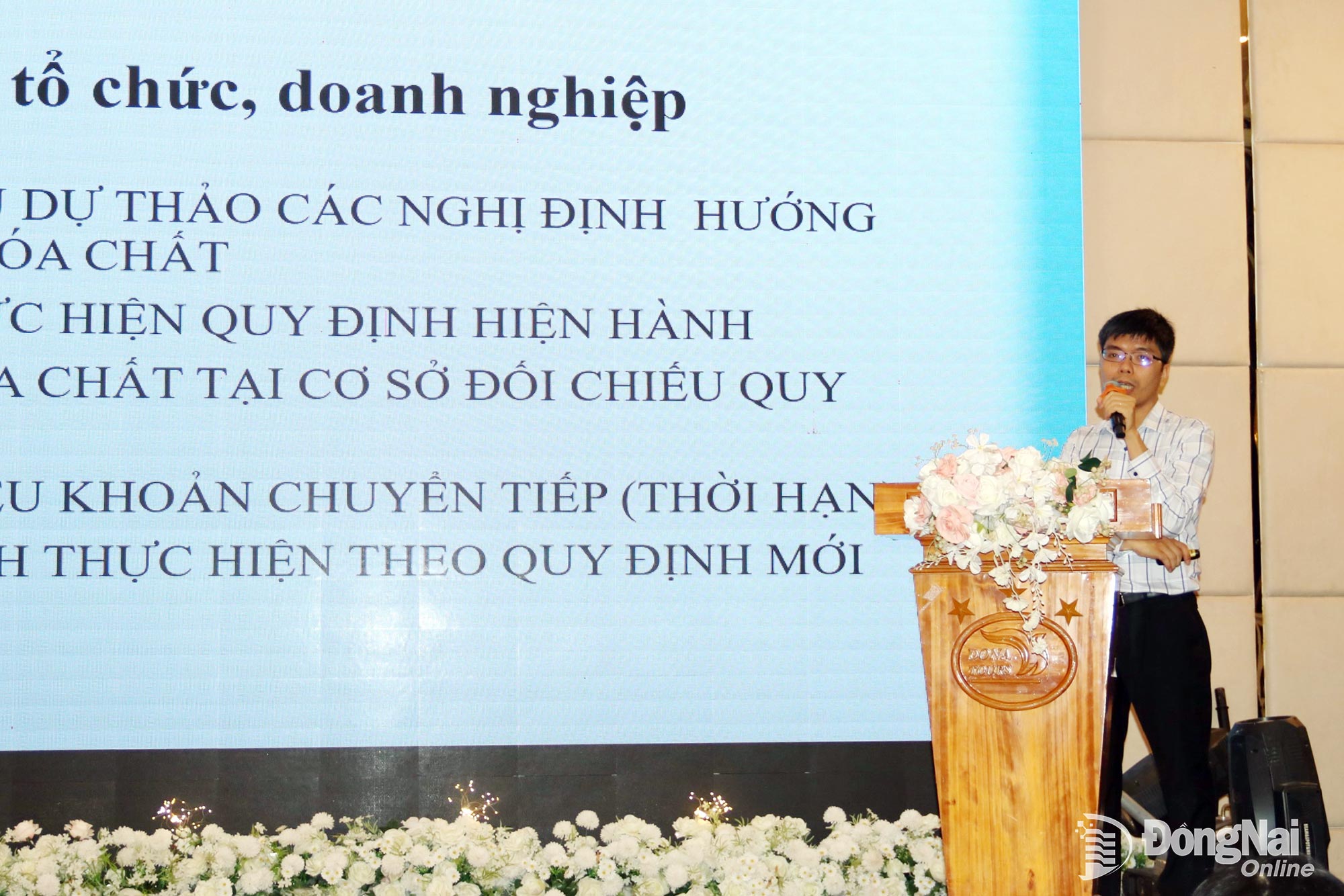 | Expert from the Vietnam Chemicals Agency (Ministry of Industry and Trade) presents key legal provisions related to chemical activities. Photo: Vuong The |