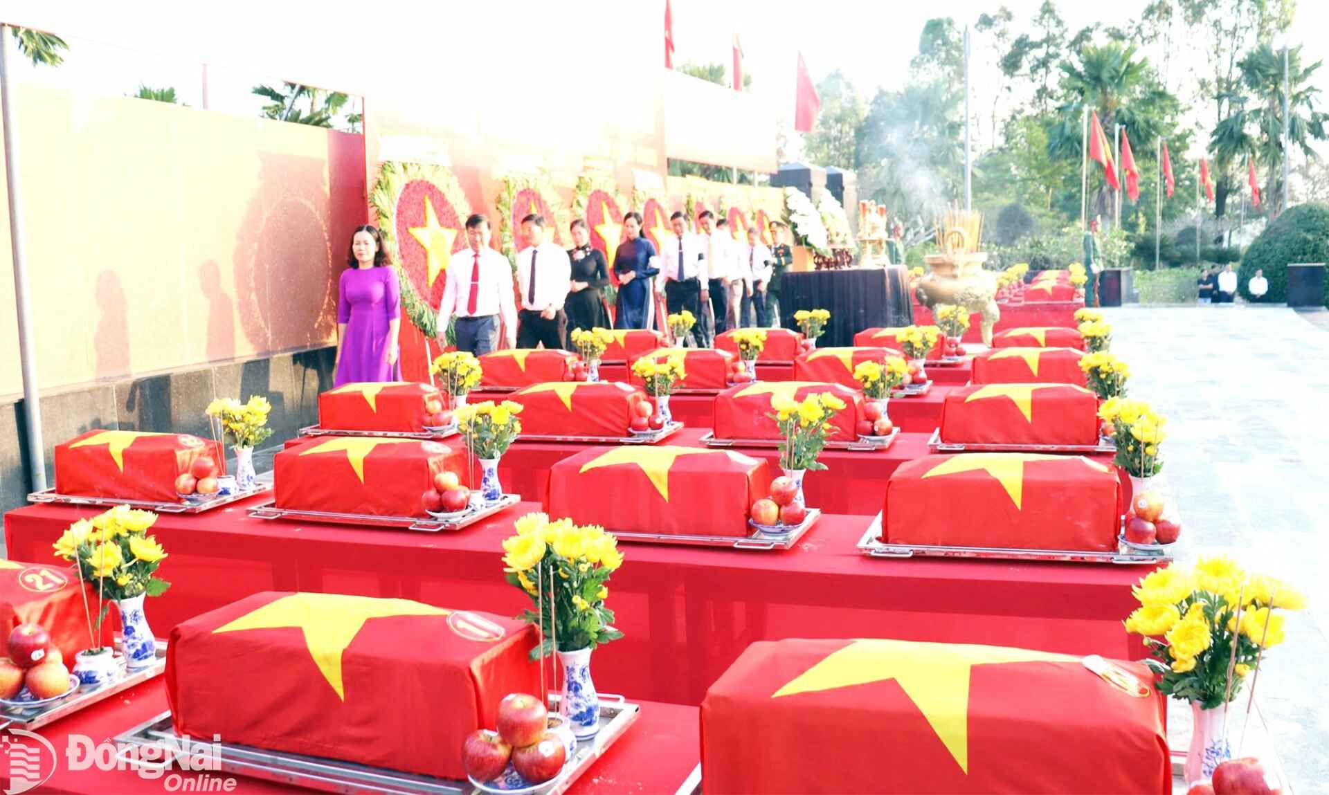 | Colonel Nguyen Van Loc, Deputy Director of the Political Department of Military Region 7, authorized by the Military Region 7 Command, and Comrade Ton Ngoc Hanh, Alternate Member of the Party Central Committee, Standing Deputy Secretary of the Dong Nai Provincial Party Committee and Chairwoman of the Provincial People’s Council, perform the ritual of escorting the martyrs’ remains to their final resting place. Photo: Nguyet Ha |