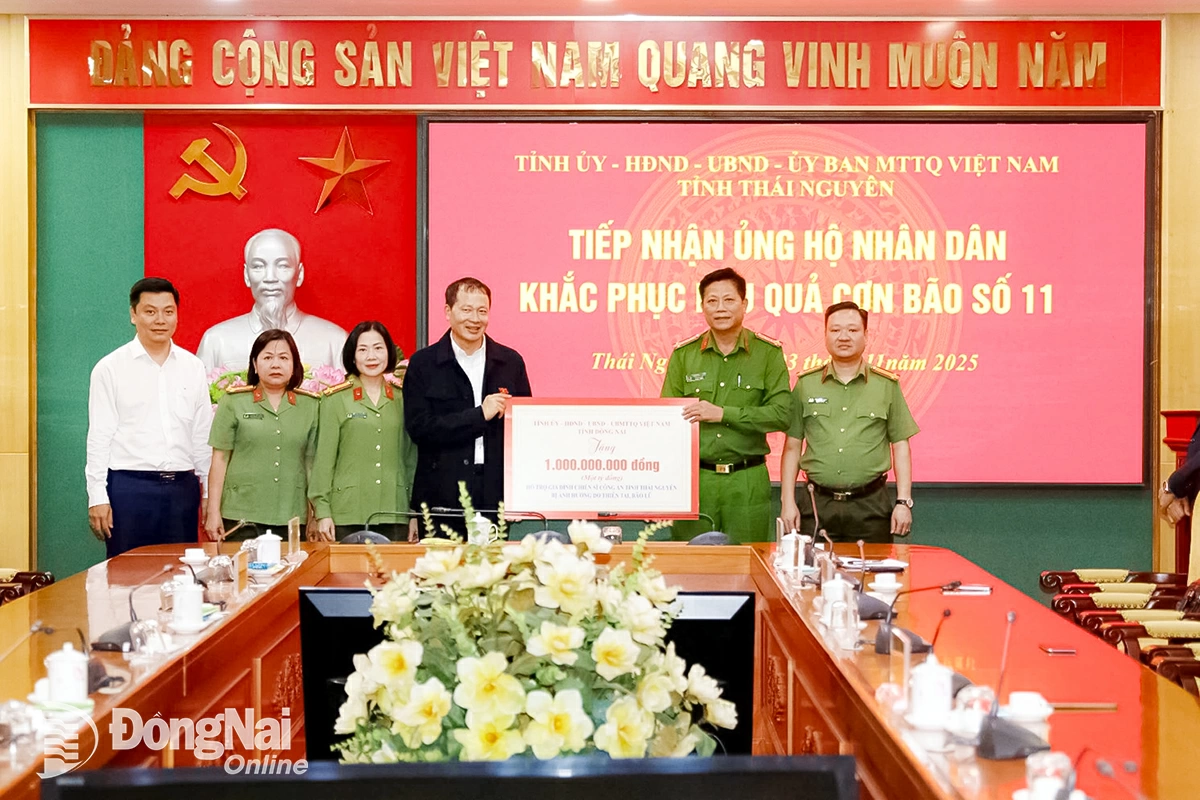 | Vu Hong Van, Secretary of the Provincial Party Committee and Head of Dong Nai’s National Assembly delegation, provides 1 billion VND to support public security officers in Thai Nguyen Province affected by the storm and floods. Photo: Trung Duong |