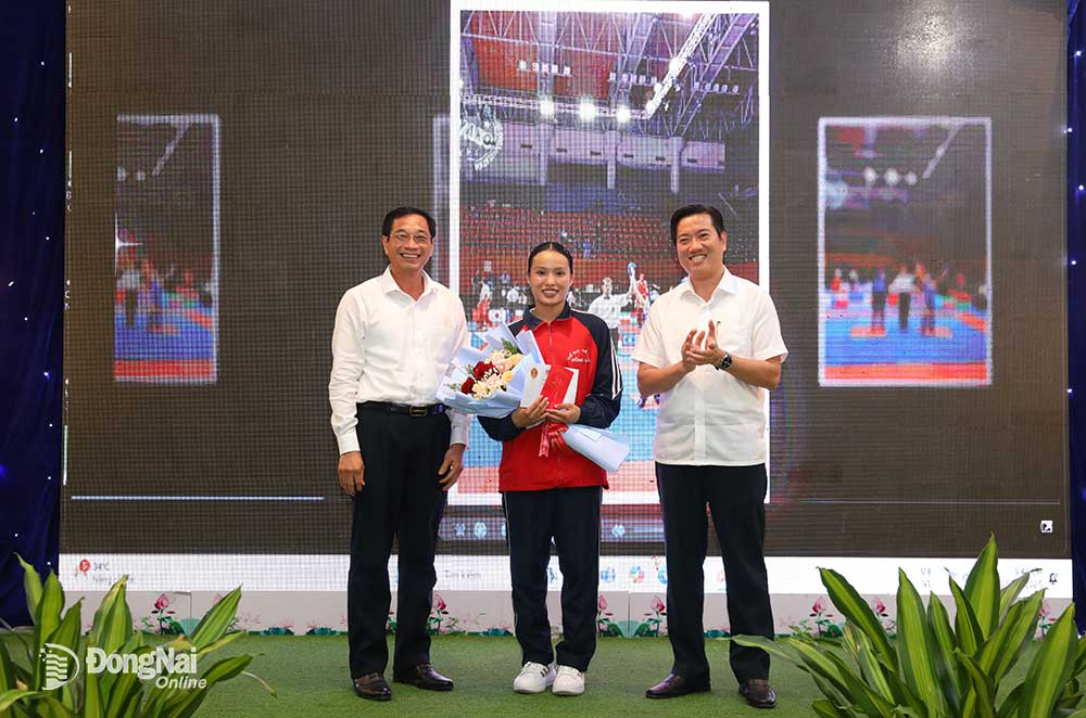 Secretary of Long Thanh District's Party Committee Vo Van Phi (left) and Deputy Director of the Dong Nai Department of Culture, Sports and Tourism Bui Thanh Nam congratulate martial artist Hoang Thi Thuy Giang. Photo: Huy Anh